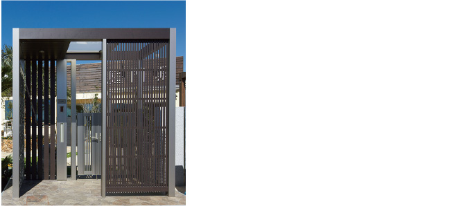 御影石+アルミで構成された門柱と千本格子ユニット(右)