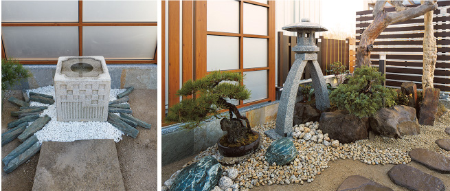 ステンレス製のデザイン立水栓とみかも石の石組みが対比美を生み出します。